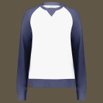 * 7.6 ounce 55% polyester/41% cotton/4% rayon, super soft fleece * Ladies' fit * Woven label * Exterior faux leather logo loop label * Contrast color V insert at center front neck * Raglan sleeves * Rib-knit collar, cuffs and bottom band